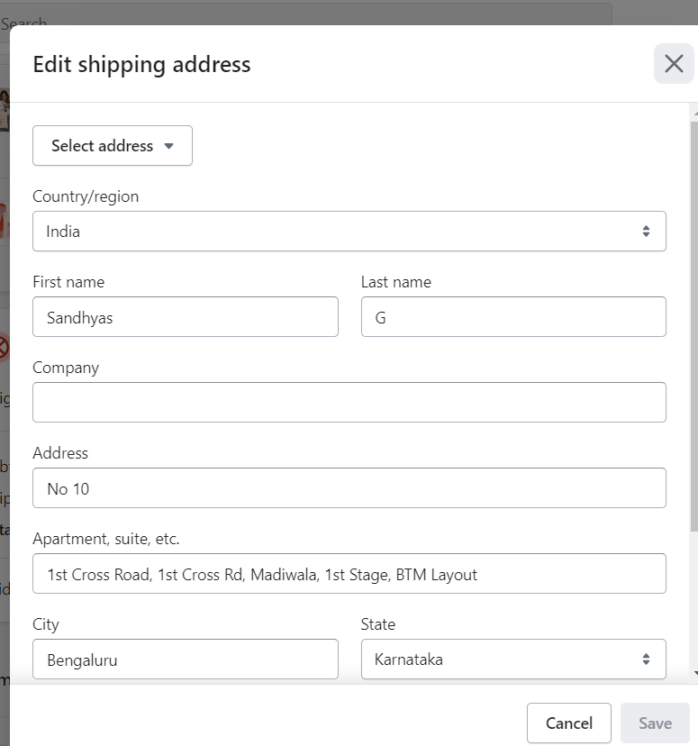 If the customer insists on a complete address change, request the customer cancel his order and guide him to place a fresh order. |