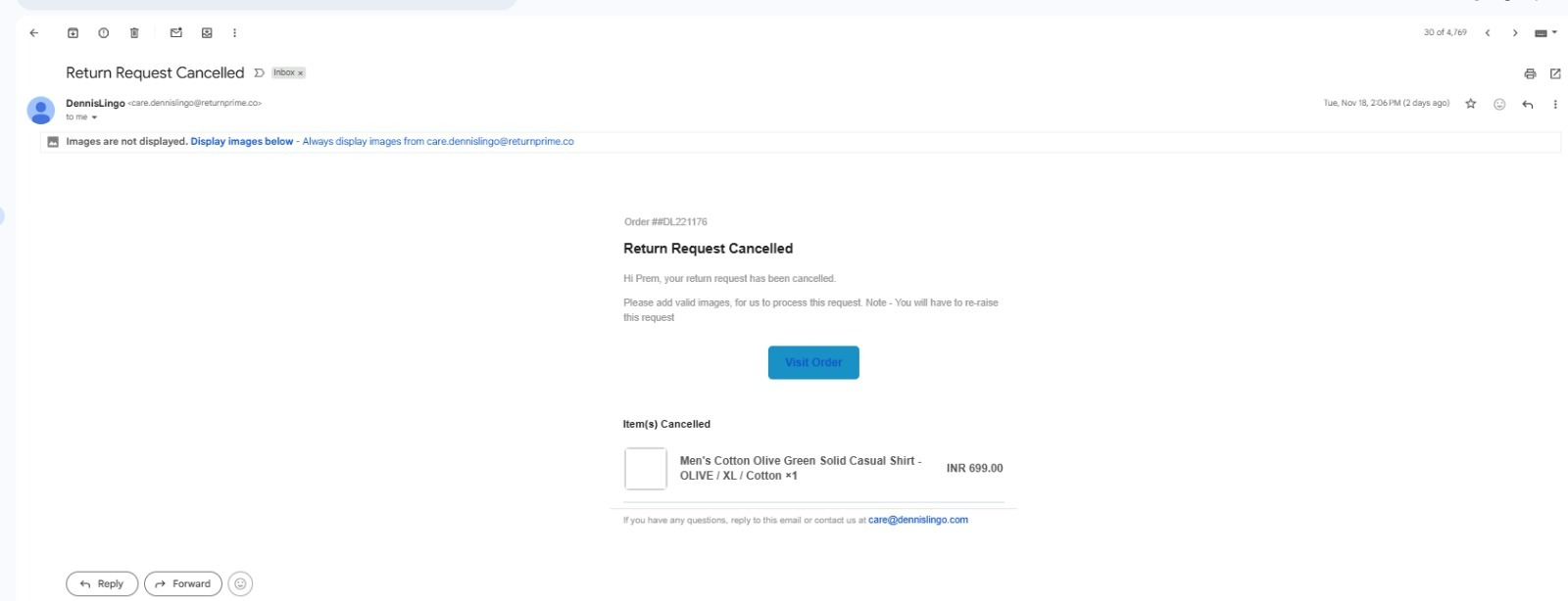 Mail stating it is cancelled